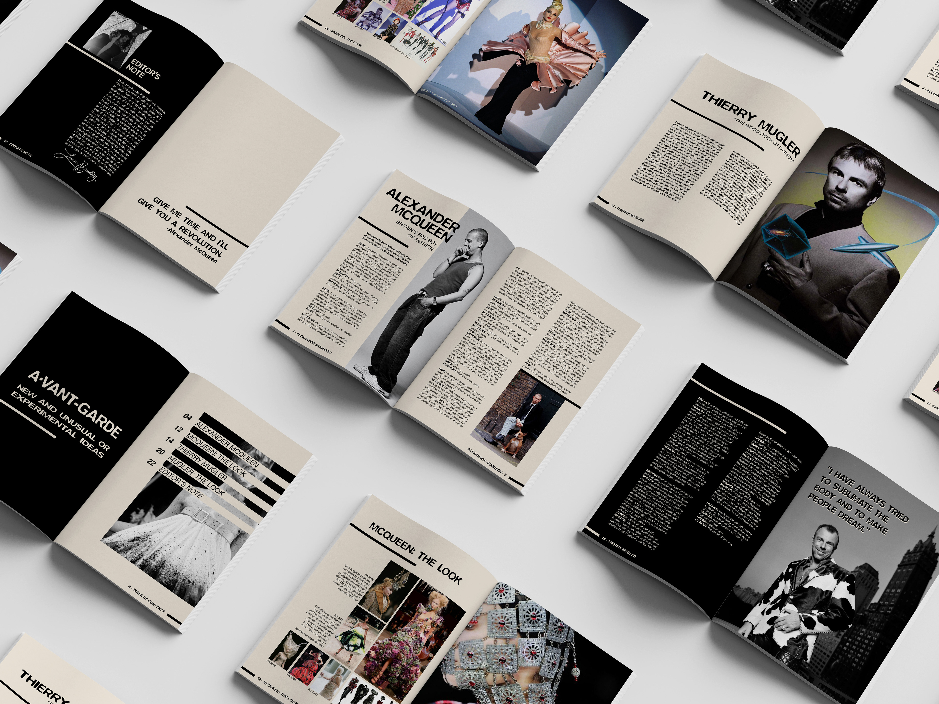 The purpose of this project was to create an interview-based magazine showcasing two artists of any craft. I chose Avant-Garde fashion as my topic and chose to highlight Alexander McQueen and Thierry Mugler as my artists. I wanted my design elements to be minimal and bold so that the focus was on the intricate work of the designers. I used line work to draw the readers eye in and create a path across each page. I wanted the magazine to have a high contrast look, hence the minimal color palette of cream and black.